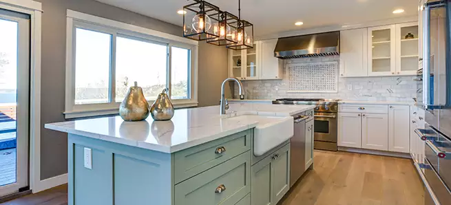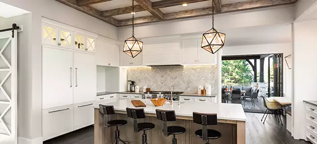 SIMPLIFY In rooms that already have a lot going on, keeping the interior trim neat and simple is a great way to let things breathe. In the kitchen seen here, a variety of textures and a statement light fixture give the room all the visual interest it needs. Understated window casings, door molding, and baseboards keep the room from looking too busy.